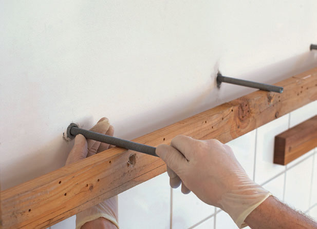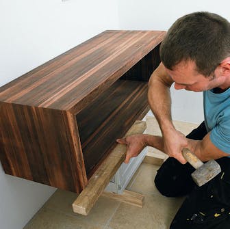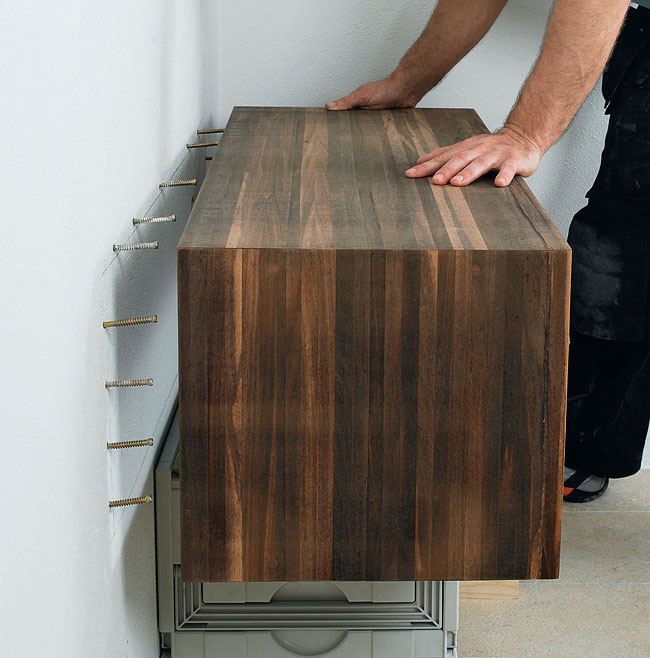 När alla skruvarnas sitter i hålen, kan hyllan bankas in mot väggen. Du behöver inget lim - hyllan sitter ändå. Lägg en bit regel mellan hylla och hammare, så att träet inte skadas.