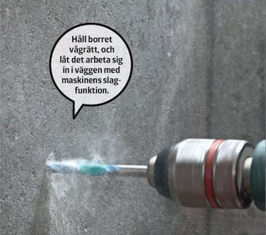 Borra med betongborr. Slå till slagfunktionen. I hård betong kan du få användning för en borrhammare. Håll maskinen vågrätt.