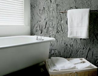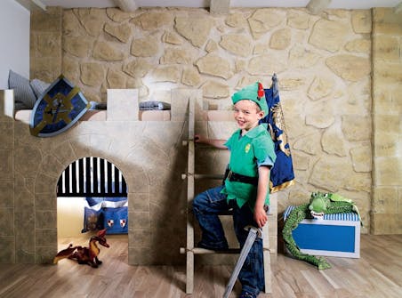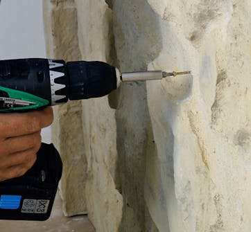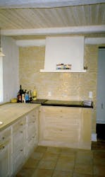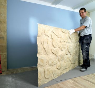 Det tog endast fyra timmar att förvandla kortväggen i detta rum från gips till ”massiv” stenvägg. Förklaringen är att vi fuskade lite och använde glasfiberskivor som är formstöpta över riktiga stenar. Monteringen är hur enkel som helst. Först skärs skivorna med vinkelslip eller sticksåg till önskad storlek och sedan fästs de med skruvar. Skarvar tätas med akrylfogmassa som kan målas i samma färg som stenarna. Skivorna tål direkt sol, fukt och temperaturväxlingar och kan användas i alla rum i bostaden.