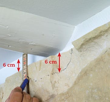 Här ska göras ett litet urtag i skivan för en takbjälke. Skivan skjuts upp mot bjälken vars form och tjocklek markeras med blyertspenna på glasfiberskivan.
