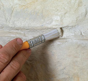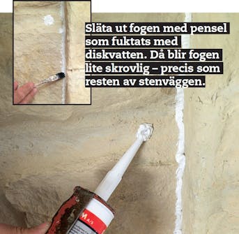När fogen har härdat målas den. Härdningen tar upp till 48 timmar. Använd akrylatfärg och lägg på den med pensel som är lika bred som fogen. TIPS: Blanda gärna lite fin sand i färgen så att även fogen får en grov struktur.