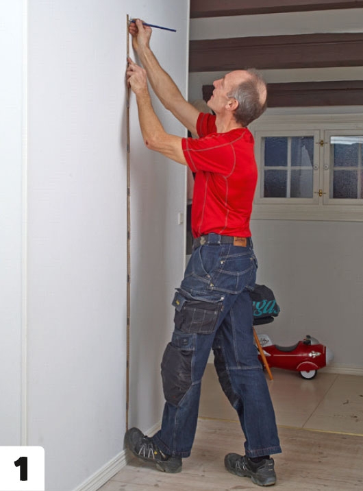 Höjden på träväggen mäts ut och markeras. Med ett långt vattenpass blir strecken i överkant helt vågräta.
