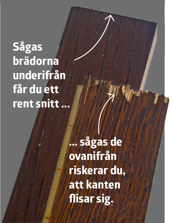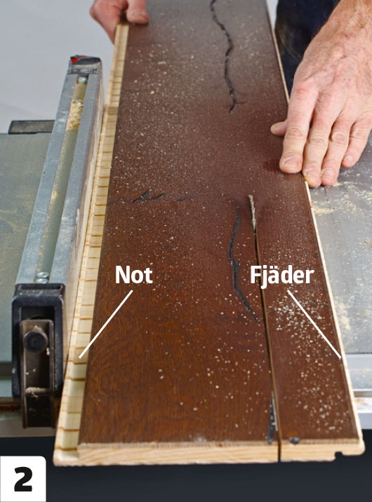 Nu kan de två avslutande brädorna kapas i bredden. Den ena sågas så att noten bevaras, medan den andra brädan sågas så att fjädern bevaras.