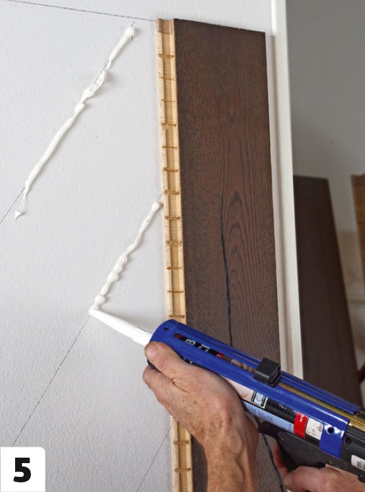 Monteringen kan börja, och vi lägger i första omgången lim på de diagonala linjerna i första brädans bredd.