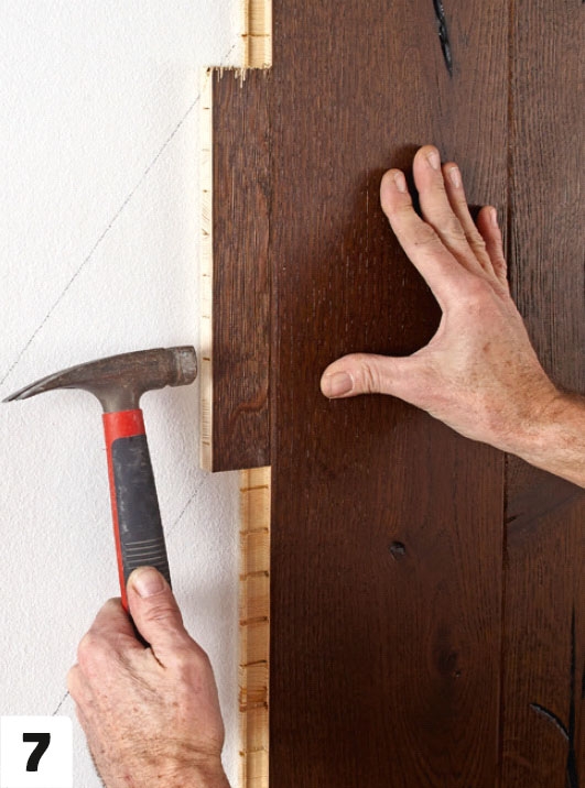 Om brädorna inte kan pressas ihop helt med händerna, kan du såga till en kloss som passar i noten. Det ger dig möjlighet att försiktigt banka ihop brädorna.
