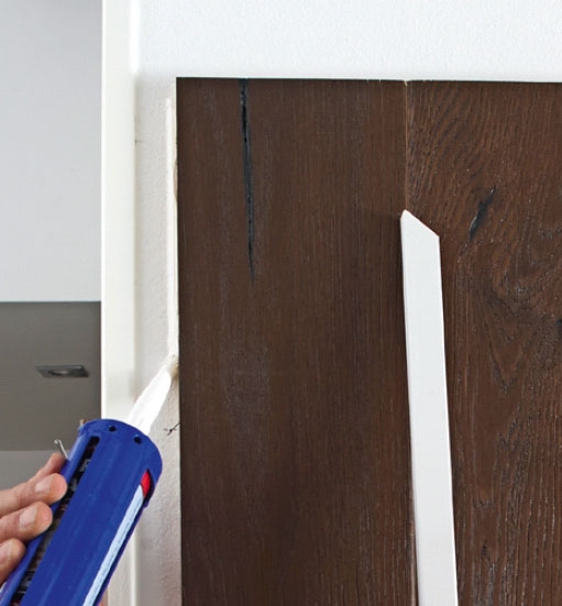 Tryck den första brädan på plats i limmet med noten framåt. Och rikta in den skurna kanten mot startlinjen och i lod.