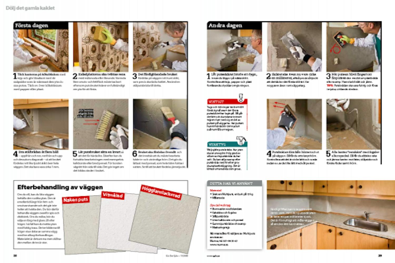 Det färdigblandade bruket fördelas på väggen i ett tunt skikt, som precis ska täcka kaklet. Använd en stålputsbräda till detta.