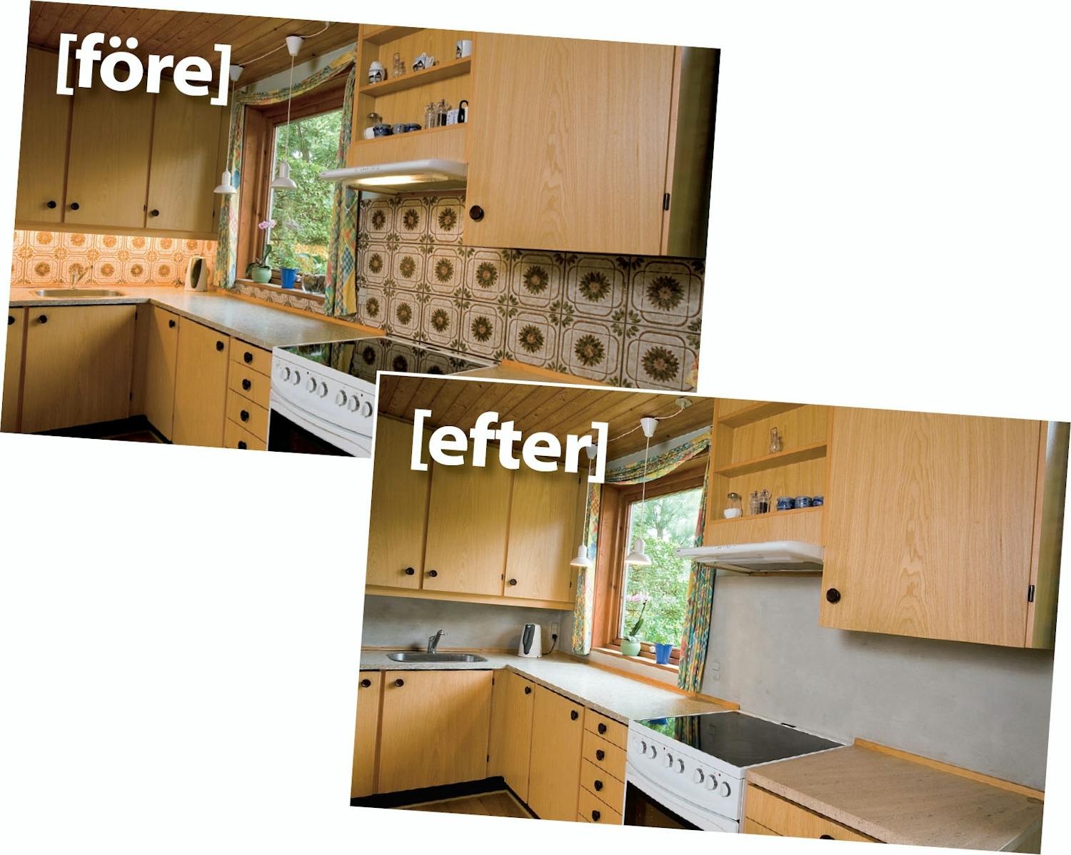 Om du vill, kan du låta väggen behålla den rustika ytan. Den är emellertid långt från fett- och smutsavvisande och det går inte heller att tvätta den. Du bör därför behandla väggen ovanför spis och diskbänk. Om du målar, bör du välja en färg med glans 20 eller högre. I så fall kan du tvätta ytan med fuktig trasa. De tre bilderna till höger visar delar av samma vägg med tre olika ytbehandlingar. Materialet är detsamma men skillnaden mellan de tre är stor.