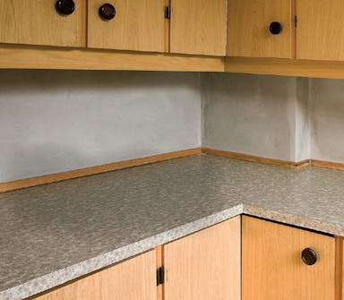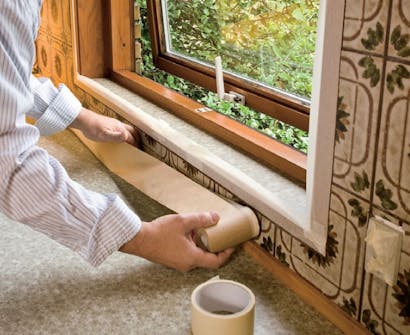 Täck kanterna på köksbänken med tejp och gör likadant med de skåpsidor som är närmast den yta du ska putsa. Täck ev. över köksbänken med papper eller plast.