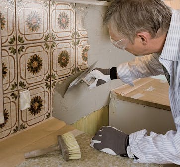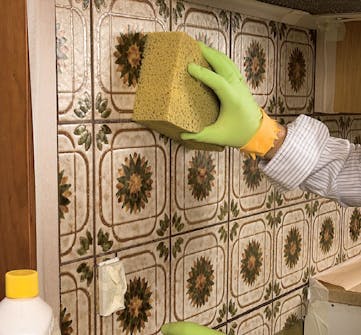 Kakelplattorna ska tvättas rena med målarsoda eller liknande. Varenda liten smuts- och fettfläck måste tas bort eftersom putsbruket kräver en fullständigt ren yta för att fästa.