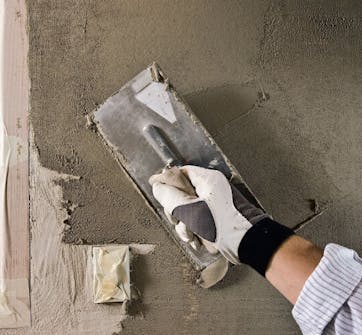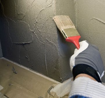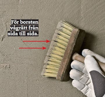Låt putsbruket sitta en kvart så att det får härda lite. Därefter kan du fortsätta bearbetningen med exempelvis kalkborste eller bred pensel. För borsten vågrätt från sida till sida. Det gör inget om det bildas ränder i bruket.