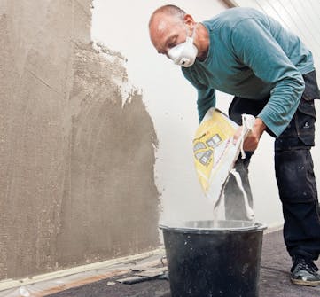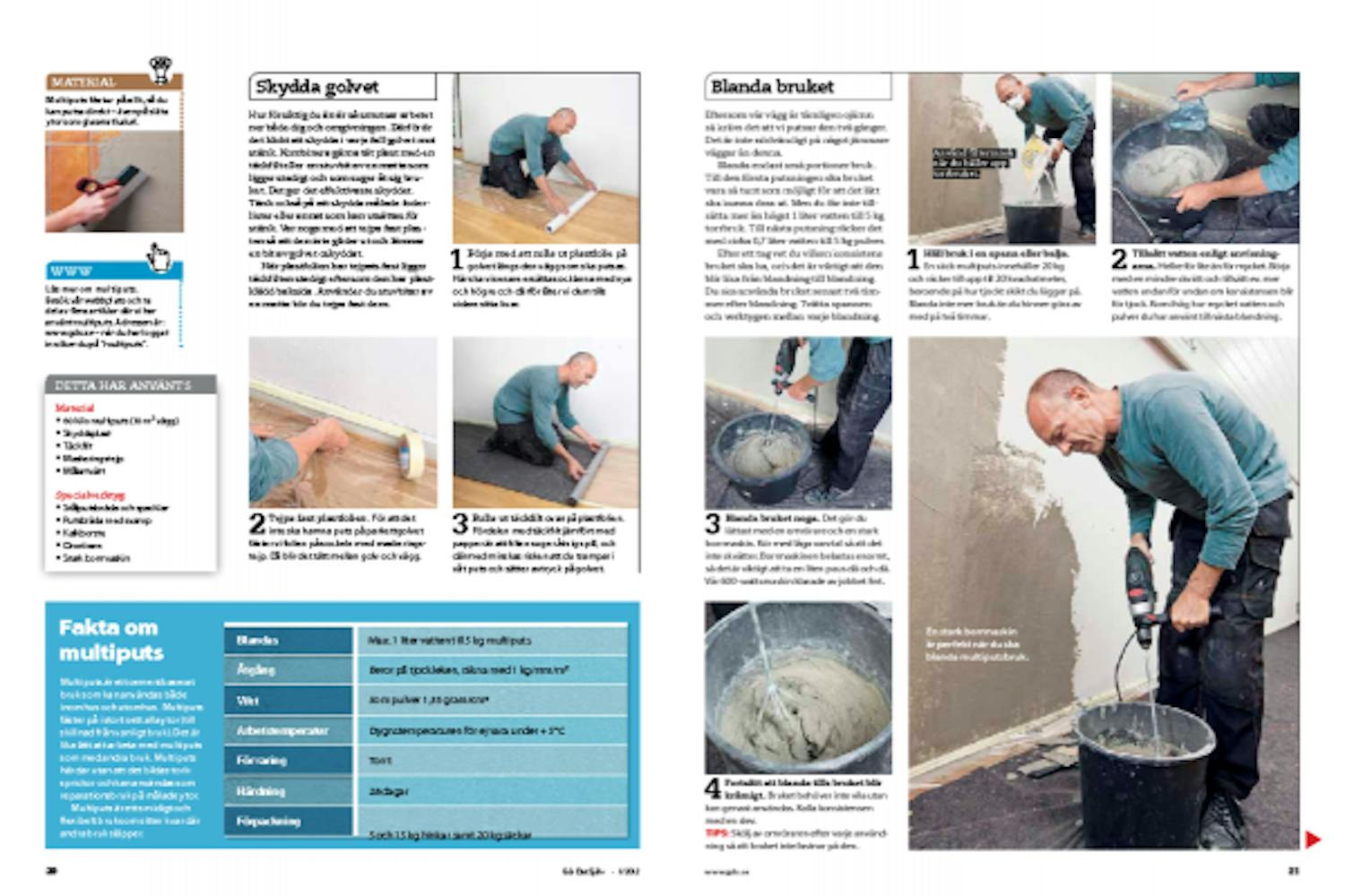 Häll bruk i en spann eller balja. En säck multiputs innehåller 20 kg och räcker till upp till 20 kvadratmeter, beroende på hur tjockt skikt du lägger på. Blanda inte mer bruk än du hinner göra av med på två timmar.