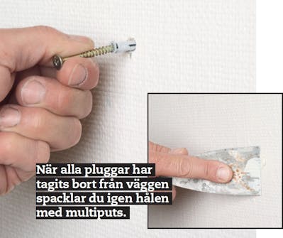 Ta bort gamla pluggar och skruvar. Fäst en skruv i pluggen och dra sedan ut pluggen. Om det inte går kan du försöka med en gammaldags korkskruv. Det gör inget om lossnar lite av väggen lossnar för du ska ju ändå spackla och putsa.