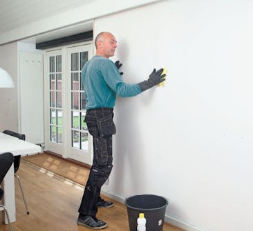 Tvätta väggen. Blanda målartvätt och vatten enligt anvisningarna på förpackningen. Tvätta väggen noga och tvätta en extra gång med enbart vatten.