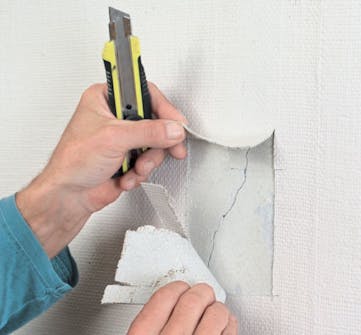 Innan du sätter igång med putsning ska du ta bort spår efter de saker som en gång har suttit på väggen. Undersök dessutom mycket noga att tapeten sitter ordentligt fast överallt (här är det en vävtapet). Tänk också på att fukten i bruket kan lösa upp tapetklister, så om en del av väggen är tapetserad på vanligt sätt, kan det vara bra att ta bort den tapeten först. Om du drar med handen över vävtapeten märker du om det finns luftbubblor.
