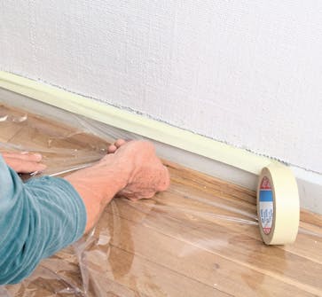 Tejpa fast plastfolien. För att det inte ska hamna puts på parkettgolvet fäster vi folien på sockeln med maskeringstejp. Då blir det tätt mellan golv och vägg.