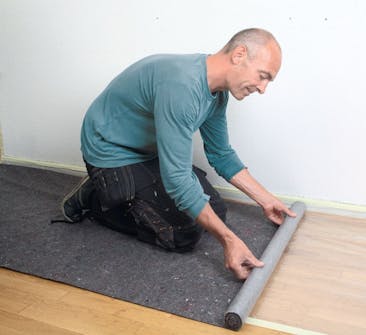 När plastfolien har tejpats fast ligger täckfilten stadigt eftersom den har plastklädd baksida. Använder du stuvbitar av en matta bör du tejpa fast dem.