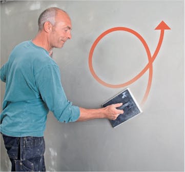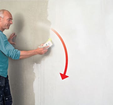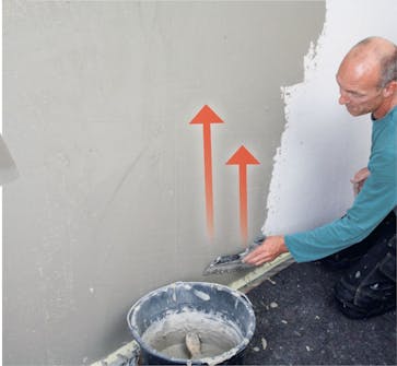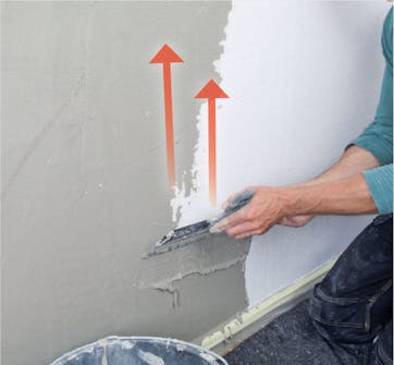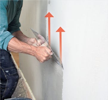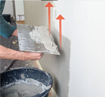 Dra ut putsbruket nerifrån och uppåt. Arbeta hela tiden vått i vått och glöm inte att fortlöpande jämna till ytan. Det gör inte så mycket om det inte genast ser perfekt ut. Fortsätt bara att dra ut och jämna till så får du en slät yta.