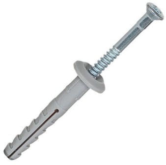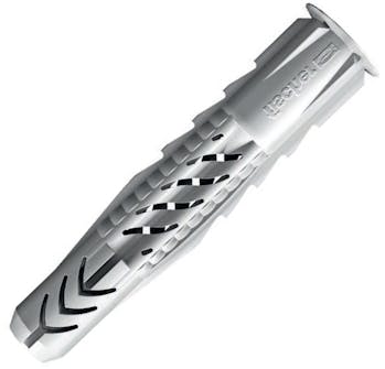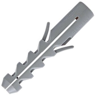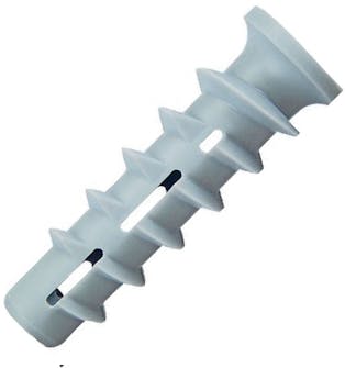 Vanlig nylonplugg för både betong och tegel. Slås in i hålet och utvidgas när en skruv av rätt storlek skruvas i. Vingarna (2 eller 4 st) fungerar som extra hullingar.