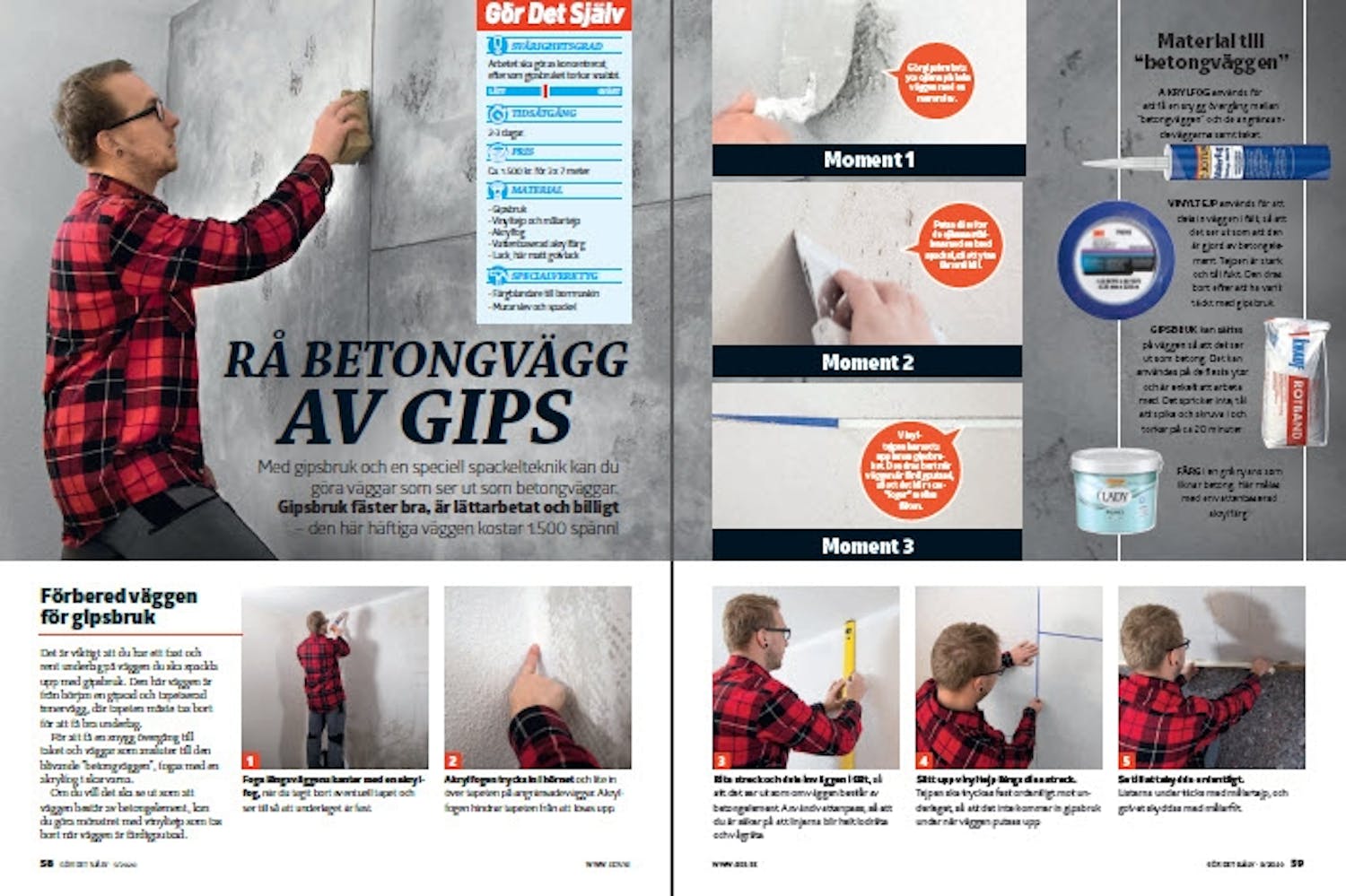 Dra av vinyltejpen när ytan har fått den där betonglooken. Kom ihåg att du har begränsad arbetstid med gipsbruket, ca minuter. Dra försiktigt av tejpen, så att kanterna blir så skarpa som möjligt.