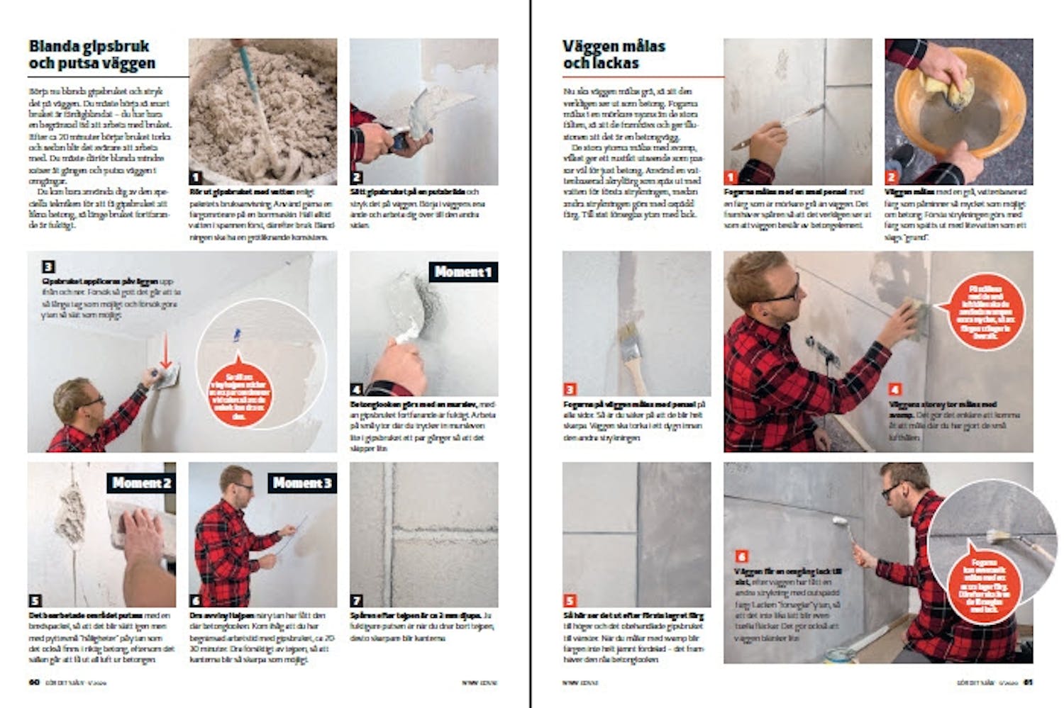 Väggen målas med en grå, vattenbaserad färg som påminner så mycket som möjligt om betong. Första strykningen görs med färg som spätts ut med lite vatten som ett slags ”grund”.
