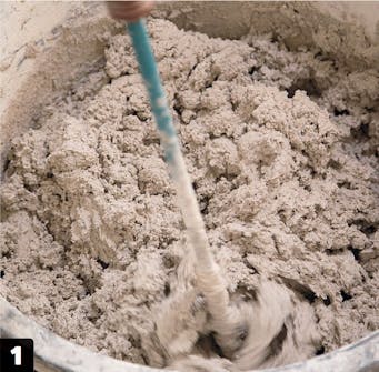 Rör ut gipsbruket med vatten enligt paketets bruksanvisning. Använd gärna en färgomrörare på en borrmaskin. Häll alltid vatten i spannen först, därefter bruk. Blandningen ska ha en grötliknande konsistens.
