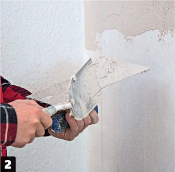 Sätt gipsbruket på en putsbräda och stryk det på väggen. Börja i väggens ena ände och arbeta dig över till den andra sidan.