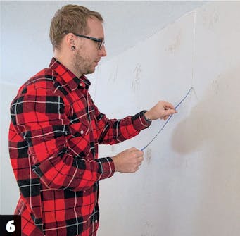 Sätt upp vinyltejp längs dina streck. Tejpen ska tryckas fast ordentligt mot underlaget, så att det inte kommer in gipsbruk under när väggen putsas upp.