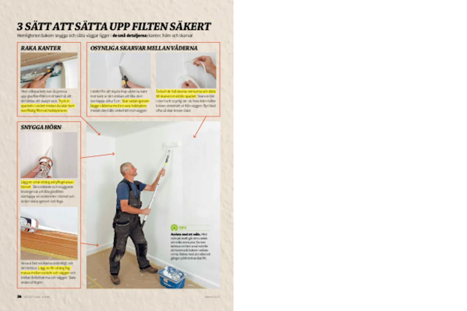 Innan du kan sätta upp glasfiberfil-ten bör väggen mättas med en primer för annars suger den ut all fukt ur väv-limmet och då släpper filten så att det bildas bubblor eller också kan den släppa så mycket att den helt enkelt ramlar ner.