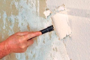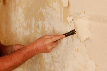 Skala av strukturtapeten från väggen. Använd ett nytt, vasst blad. Det gör inget om det sitter flera lager tapet. Håll tapetskrapan i en flack vinkel längs med väggen så att bladet inte skär in i putsen.