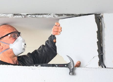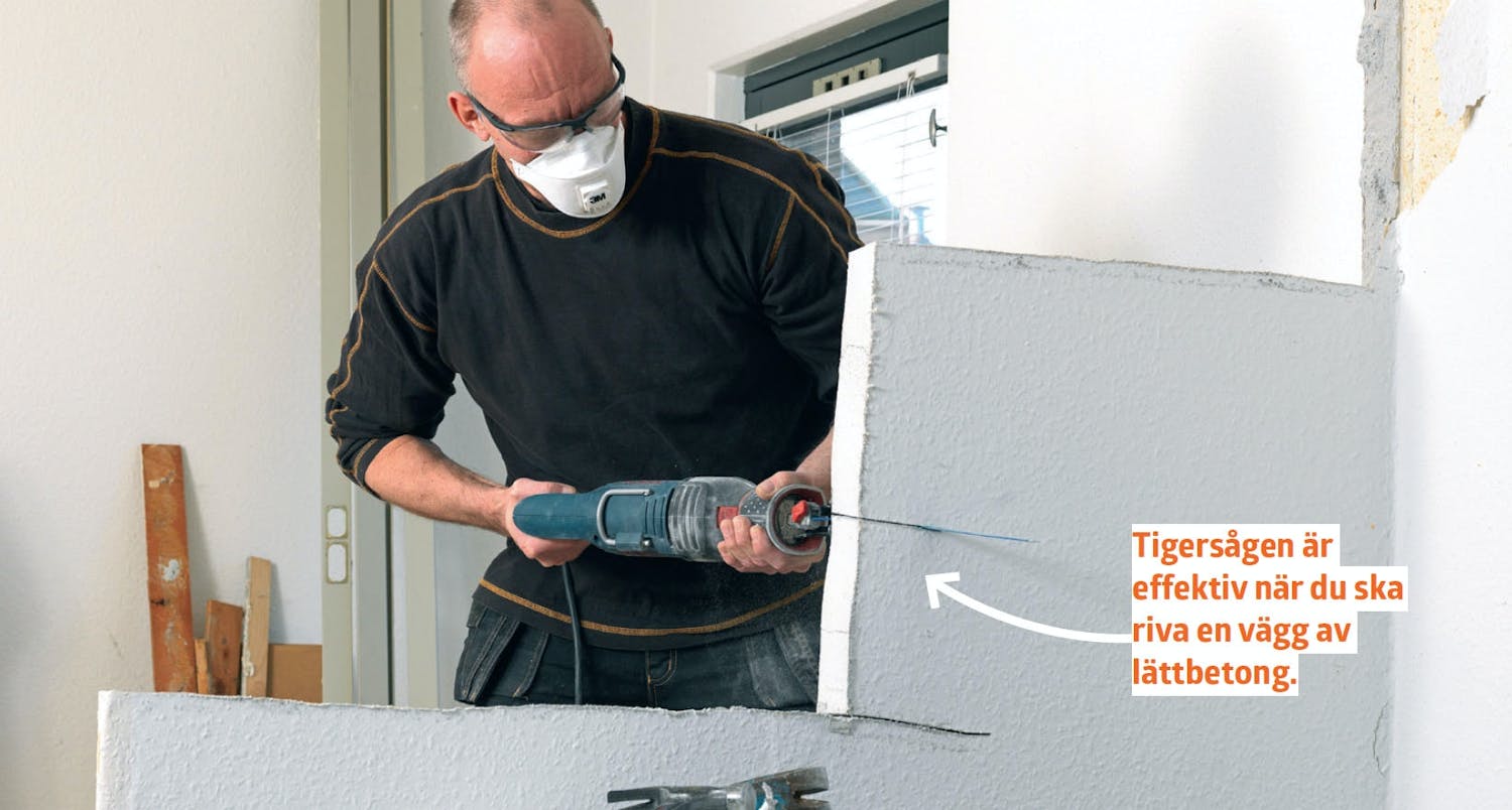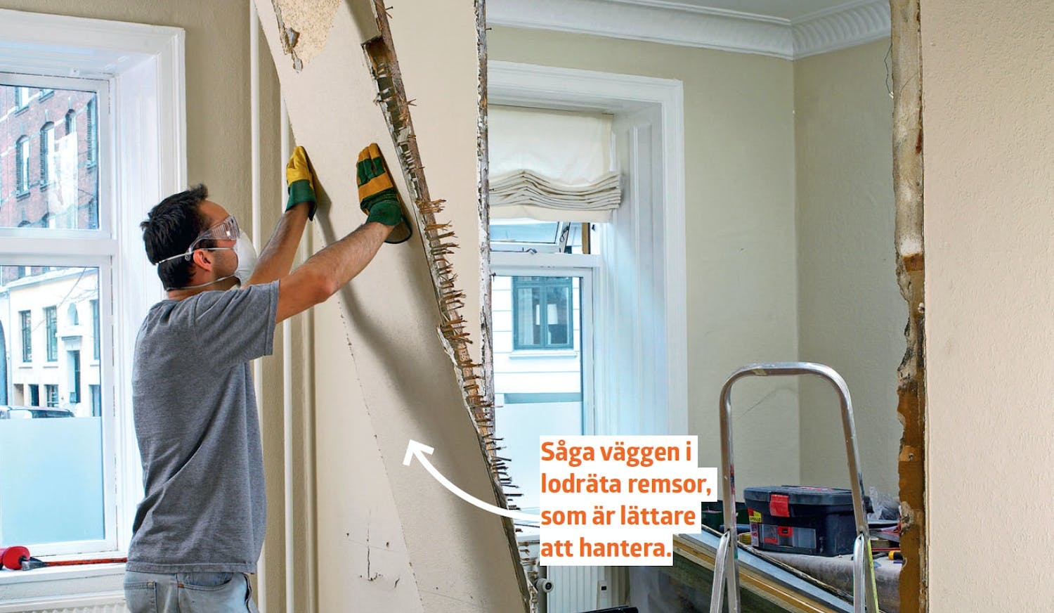 Avlägsna alla lister, paneler och annat som är monterade på väggen. Om väggen är fogad tätt mot angränsande väggar och tak, sågas fogen upp så att det blir så lätt som möjligt att reparera skadorna. Börja rivningen överst under taket med en tigersåg. Såga ett vågrätt snitt på 20-30 cm.