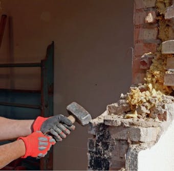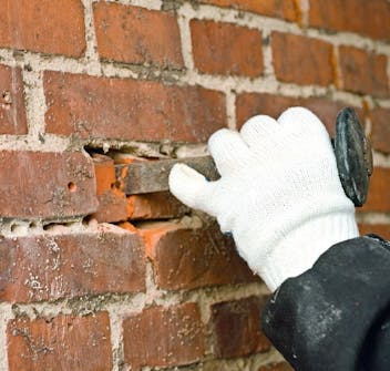 De första stenarna avlägsnas genom att kratsa, fräsa, borra och banka loss fogarna runt om stenarna. Välj en sten i en av de översta raderna på den ena sidan av väggen. Det tar lite tid att få hål på väggen, men efter det går det snabbt.