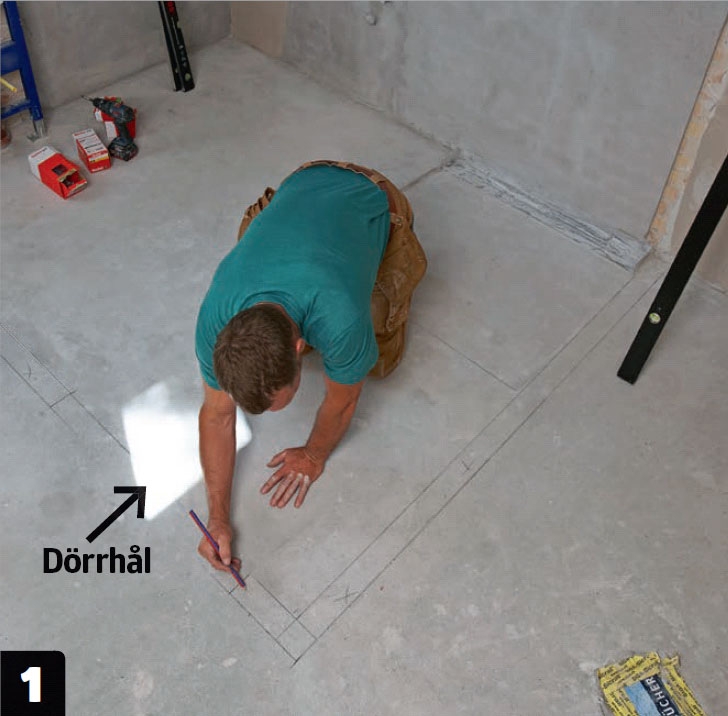 Rita upp var på golvet väggarna ska placeras. Ytterväggarna, som man mäter vinkelrätt från, är utgångspunkten. Använd ett måttband eller en linjelaser. Rita upp på väggarna och innertaket samt för dörrhålet.