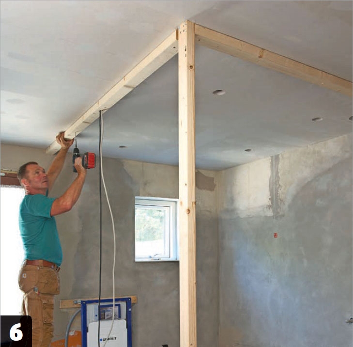 Skruva fast reglarna i innertaket. Taket består av skruvfasta fibergipsskivor. Reglarna skruvas fast med vanliga spånskruvar. De två ledningarna är avsedda för vägguttag som ska placeras vid dörren.
