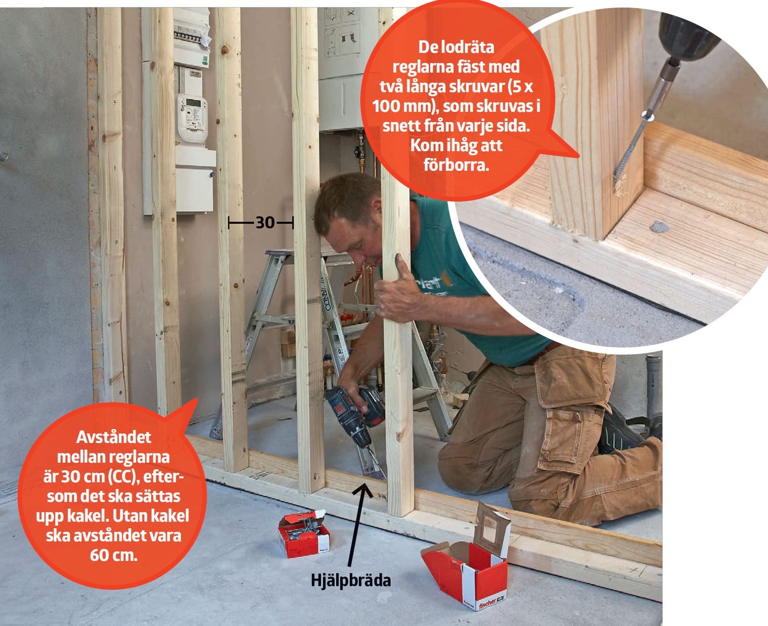 Avståndet mellan de lodräta reglarna har anpassats så att det passar med monteringen av fibergipsskivorna som har måttet 90 x 120 cm.