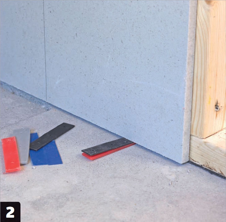 Den lodräta regeln vid dörren skruvas fast med två 5 x 100 mm-skruvar på bottenplattan. Lägg märke till avståndet till den korta bottenregeln som ska sträcka sig till dörrhålet. Nu finns det plats för gipsskivan.