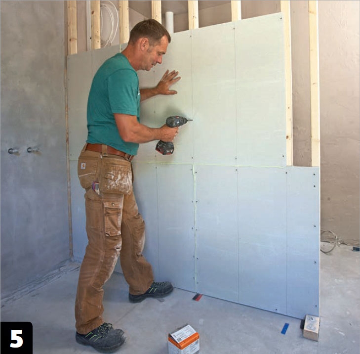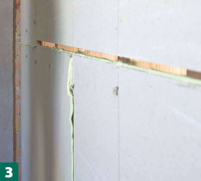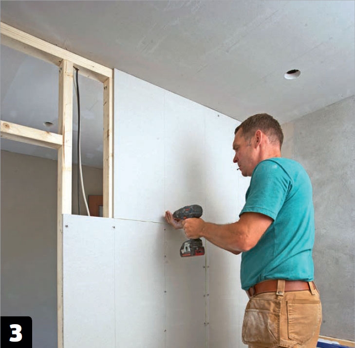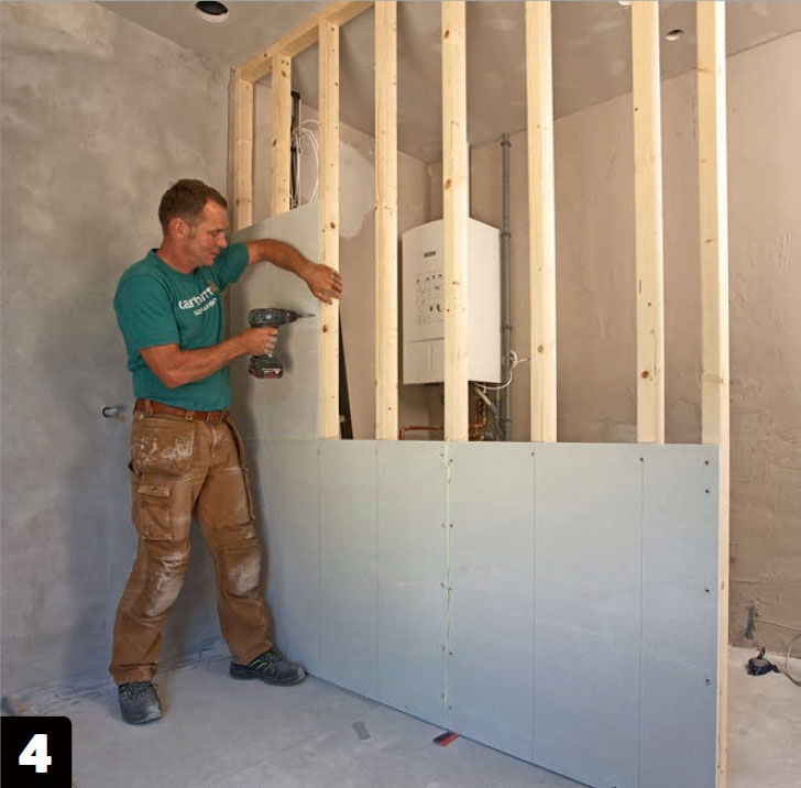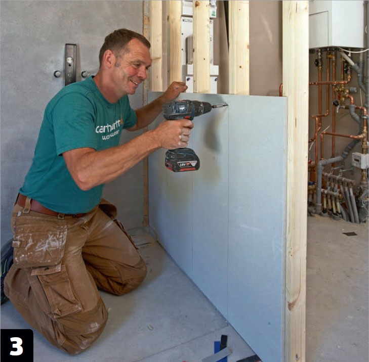 Väggen kläs med fibergipsskivor precis som på den andra väggen - skivorna placeras i förband, limmas ihop och skruvas fast.