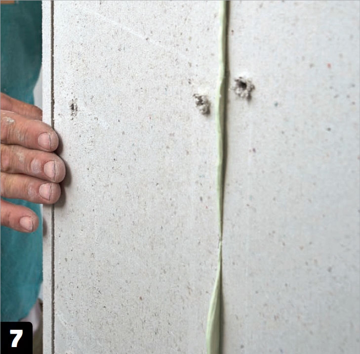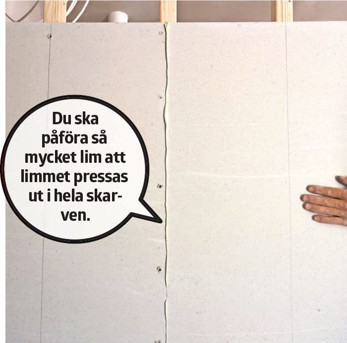 Skivorna limmas ihop. Fördelen med detta är att det inte finns spackelkanter som ska skäras bort. På så vis undviker du spill och det räcker med att avsluta med att spackla en gång.