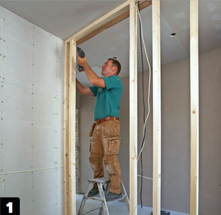 Trästommen med dörröppningen ska nu göras klar. När vi väntar med att göra stommen helt färdig, beror det på att vi får ett starkare hörn på den vinkelräta väggen om gipsskivorna går in bakom vid väggen med dörrhålet.