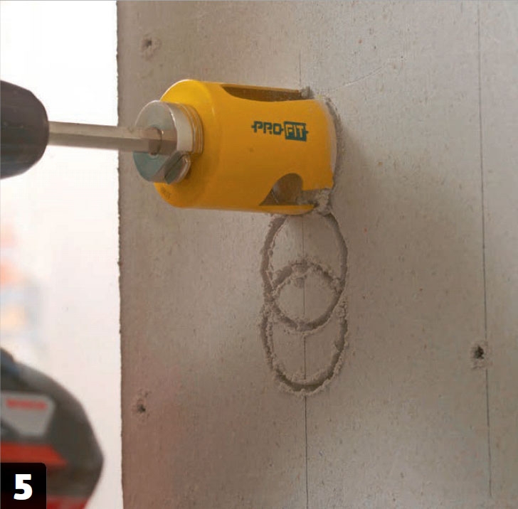 Borra ut för ev. vägguttag. Här används en hålsåg på 56 mm från ProFit som är det mest lämpliga borret för fibergips. Flera hål borras bredvid varandra, eftersom det ska finnas plats för ett större vägguttag.