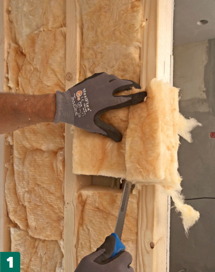 Mineralullen skärs till med en kniv så att den passar in mellan de lodräta reglarna. Det är bra om den sitter en aning spänt.