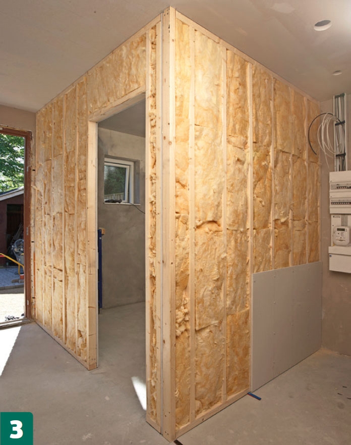 När du har satt upp fibergipsskivor på den ena sidan av trästommen, ska du isolera väggarna. Det gör du lätt och effektivt med mineralull som skärs till med en kniv så att mineralullen passar mellan reglarna. Det finns mineralull i en tjocklek på 75 mm som passar in precis på reglarnas mått.