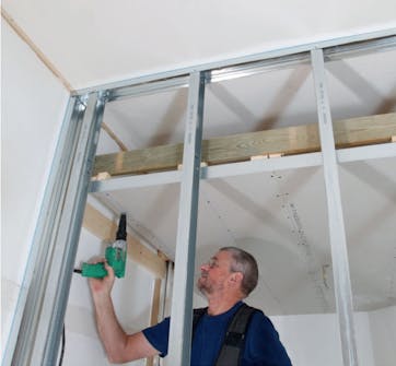 Även i taket ska det monteras skenor. De ska överlappa skenorna på väggarna. I det putsade taket fästs skenorna med 5 x 60 mm skruvar i glespanelen.