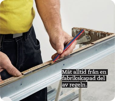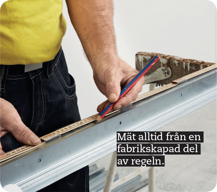 Gör överliggaren till öppningen av en golv- eller takregel. Till en dörrbredd på 90 cm ska överliggaren vara 100 cm och du sätter märken vid 10 cm och 110 cm, för där ska regeln bockas.
