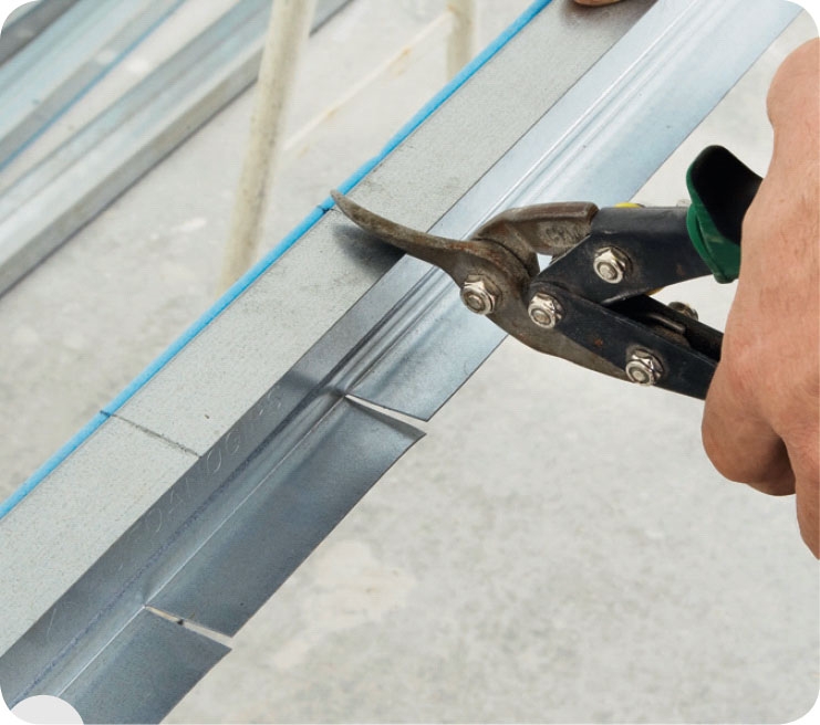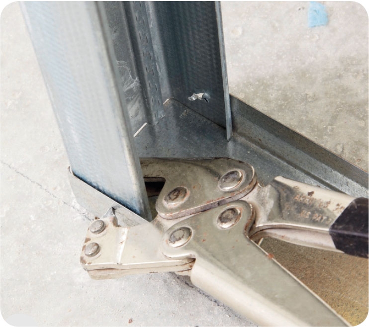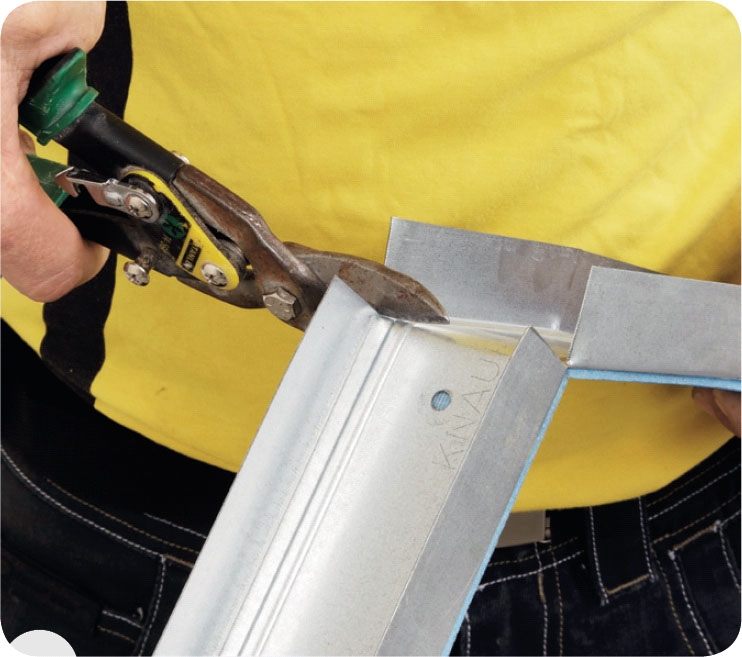 Kläm ihop reglarna och lås dem. Det lättaste och snabbaste är att flxera reglarna med hjälp av en specialtång. Har du ingen sådan kan du i stället skruva ihop delarna med självborrande skruvar.