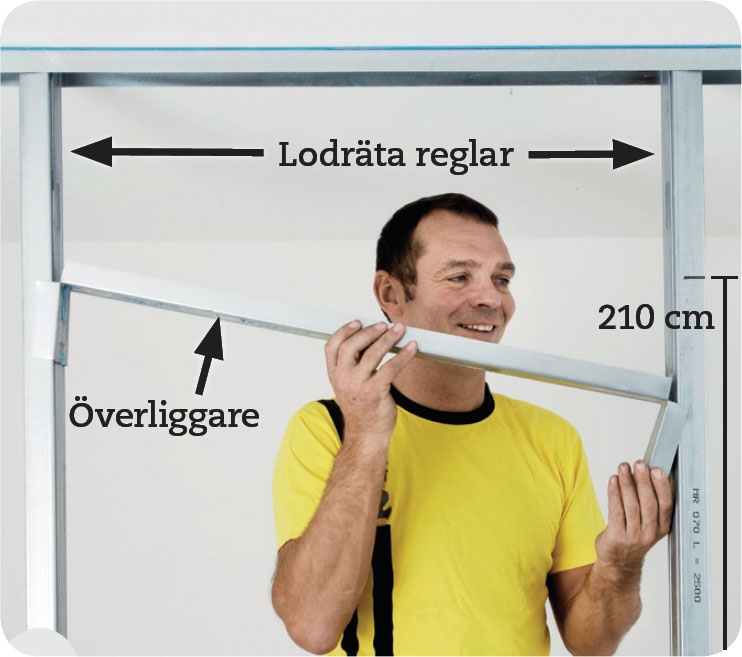 Trä överliggarens korta bitar över de två lodräta reglarna, och placera överliggaren så att undersidan sitter exakt 210 cm ovanför färdig golvbeläggning. Lås den med flxertång eller skruvar.