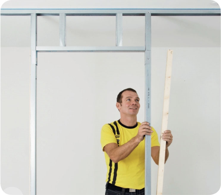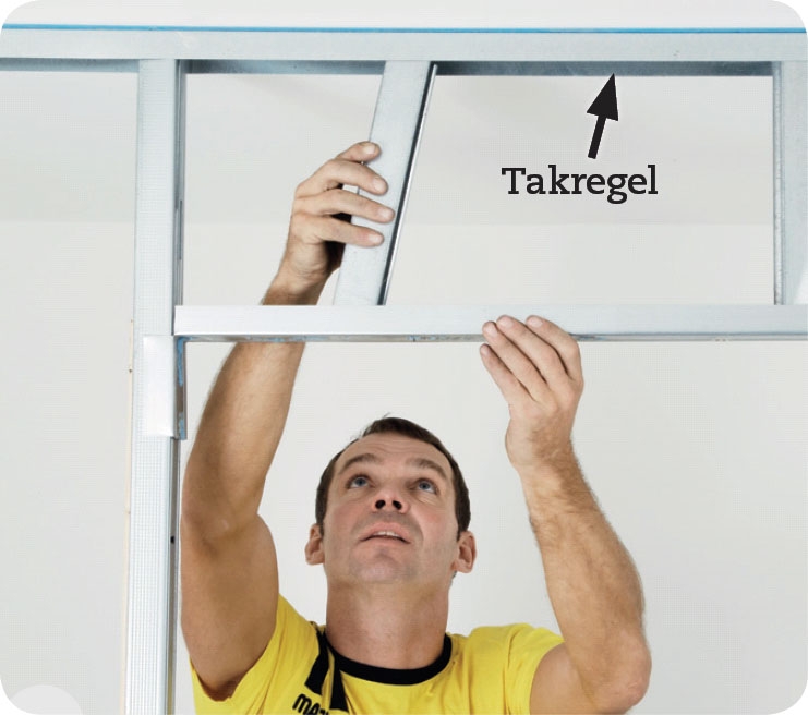 Sätt en eller två korta reglar mellan takregeln och överliggaren. Reglarna ska placeras så att de ingår i regelstommens mönster med reglar på var 45:e eller 60:e cm breoende på hur breda gipsskivorna är.