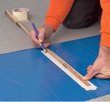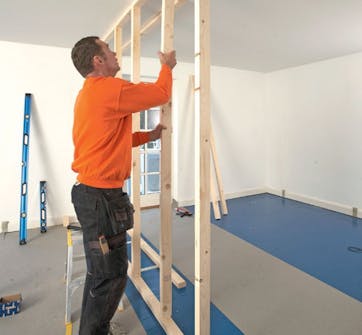 Markera var väggen ska stå så att du har stödpunkter på väggarna, i taket och på golvet. Här har du stor glädje av en krysslaser, men det går även med mätband, vattenpass och vinkel. Markera på maskeringstejp som lätt kan tas bort.