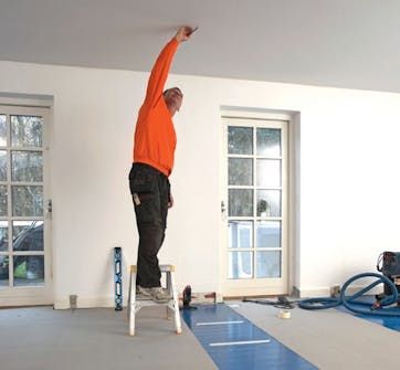 Överliggaren limmas och skruvas fast i taket eftersom vi inte har någon glespanel att fästa skruvarna i - endast gipsskivor. Har du glespanel (eller trätak) räcker det med enbart skruvar, t.ex. 5 x 90 mm så att de verkligen får grepp.