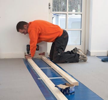 Fäst reglar på golvet med 4 x 70 mm skruvar (om du har trägolv). Förborra i reglarna så blir det lättare att dra ner dem hårt mot golvet. Sätt skruvarna på cirka var 50:e centimeter.